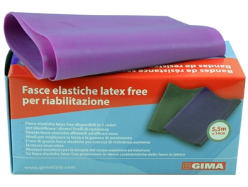 Fasce senza lattice in 7 colori relativi ai diversi livelli di resistenza e 3 lunghezze (1,5, 5,5 e 45 m).